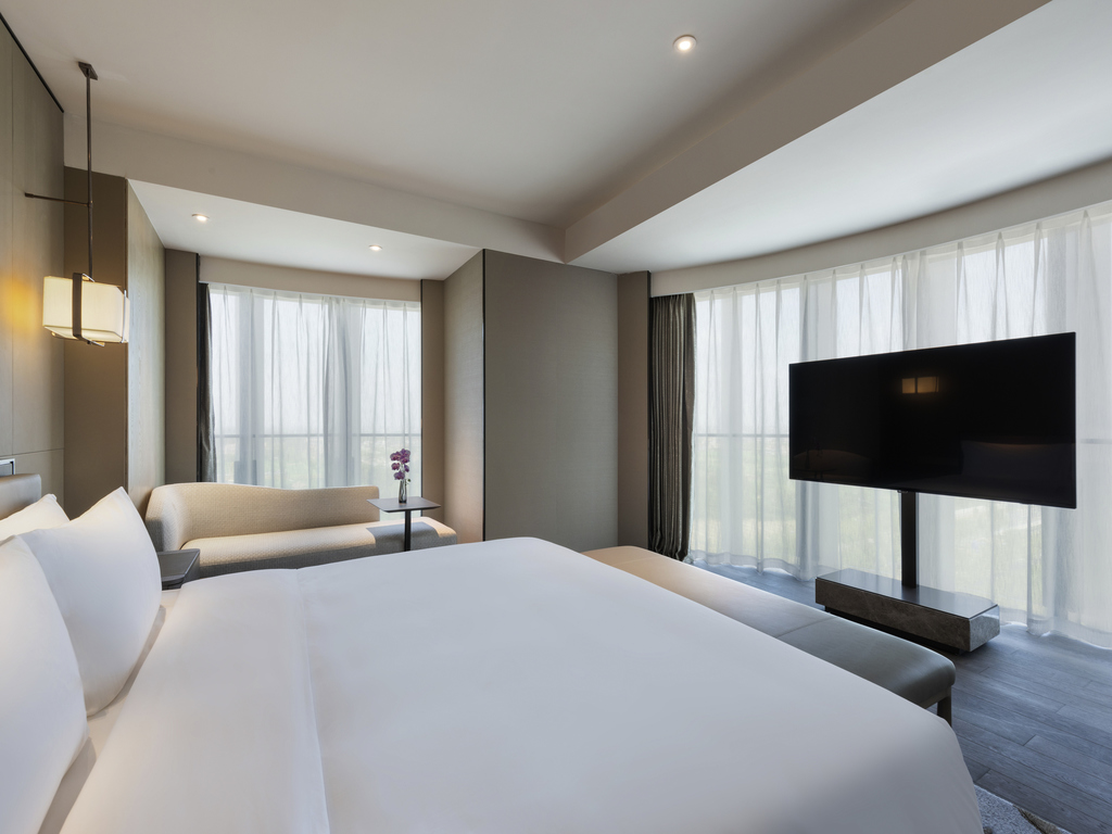 每间客房均配备 65 英寸液晶电视、免费无线网络、迷你酒吧和独立浴室。